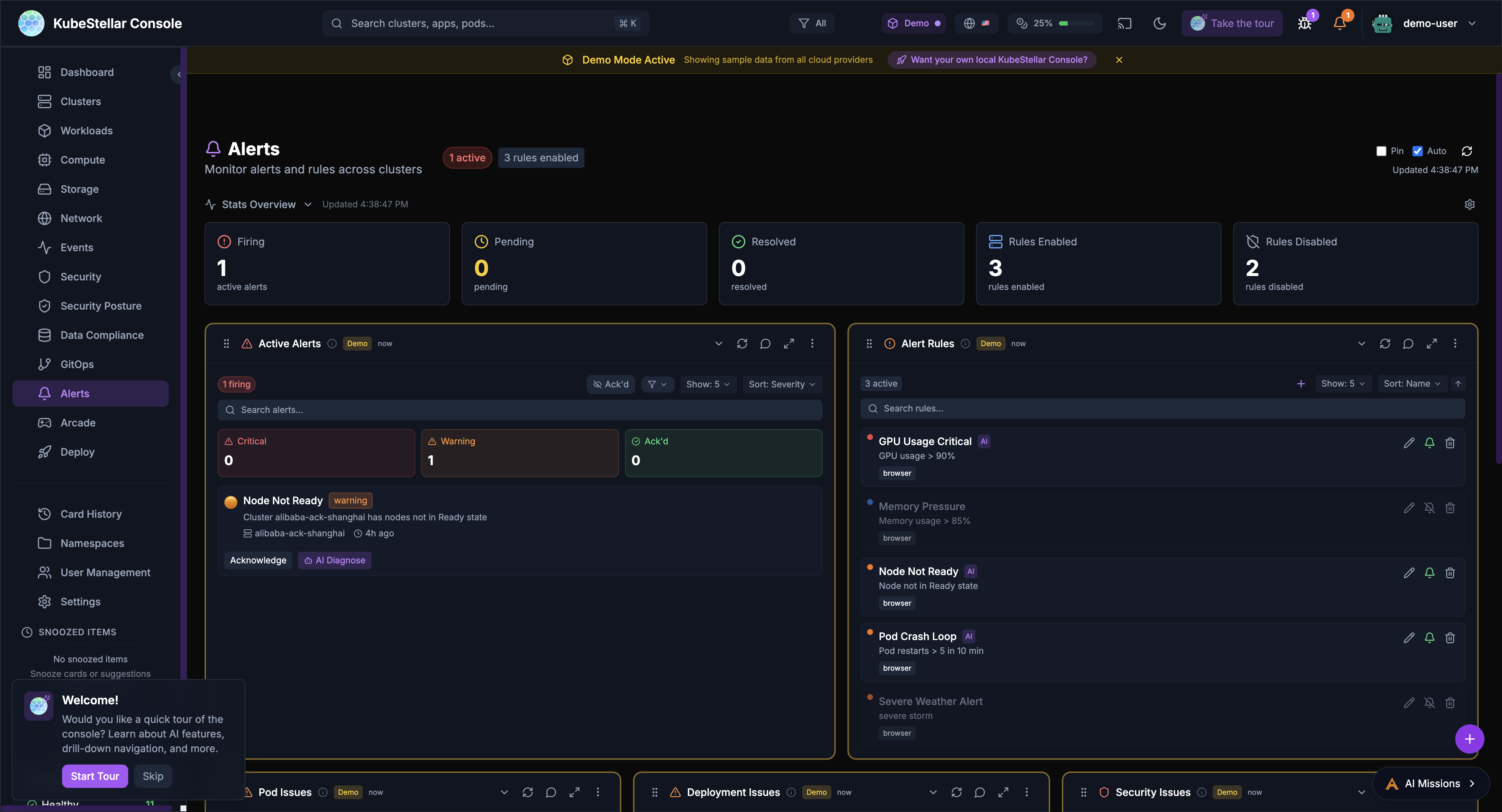 KubeStellar Console has 20 different dashboards. Each shows you different information about your Kubernetes clusters.